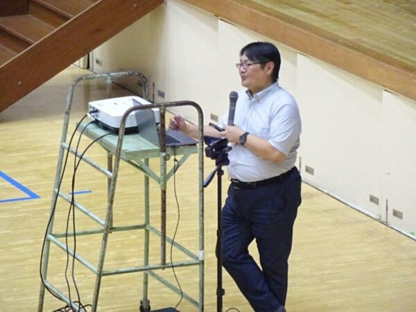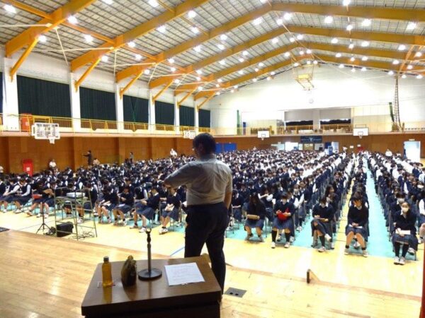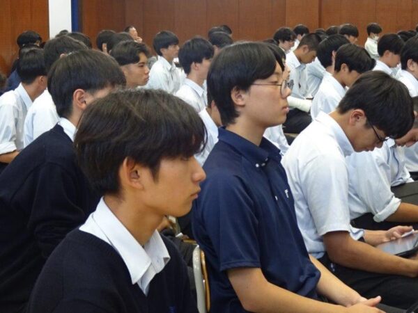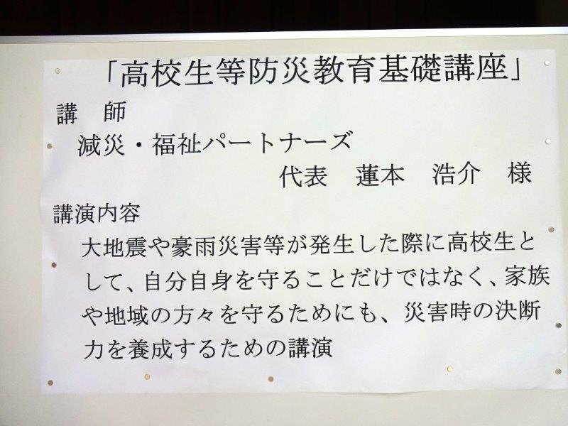 10月2日(木)、今年度の防災週間の一環として防災教育講話を実施しました。校内のすべての人の防災意識を高め災害に対する知識の向上を目的として、減災・福祉パートナーズ代表の蓮本浩介様を講師にお迎えし講話を行っていただきました。過去の災害の映像やさまざまな実験映像などを織り交ぜ、自分のこととして災害を捉えるようにすることの大切さを教えていただきました。生徒たちも真剣に話を聞き、「いつどこで起こるかわからない」「常に備えることが大切」などの感想が聞かれました。蓮本様、本日は本校生徒・教職員のために貴重な講話をありがとうございました。