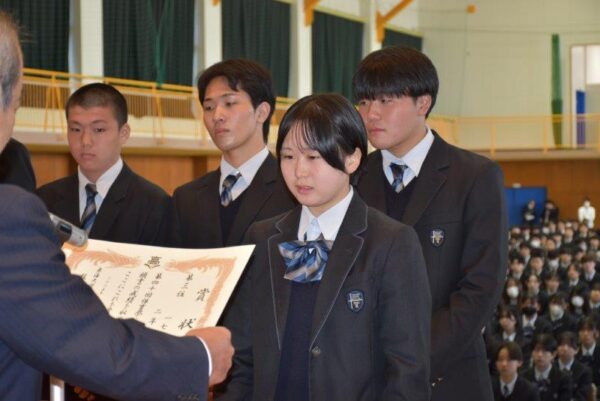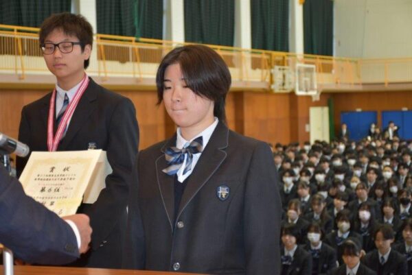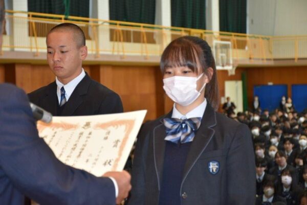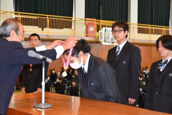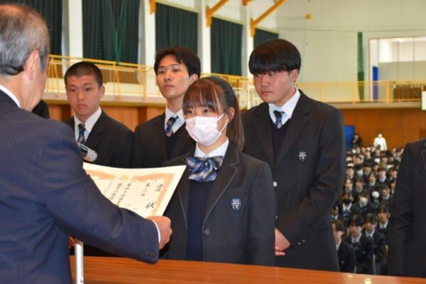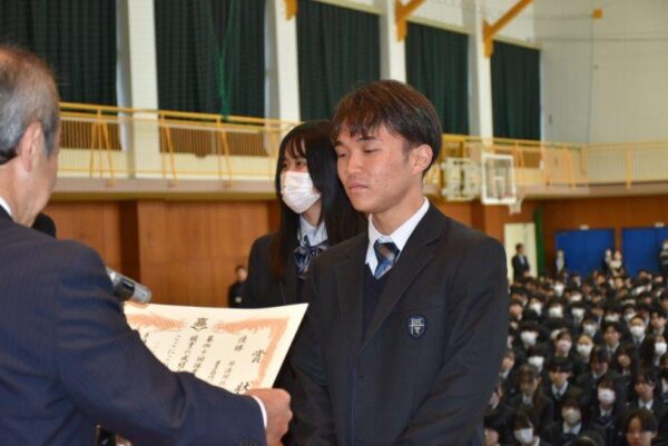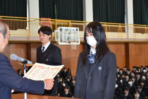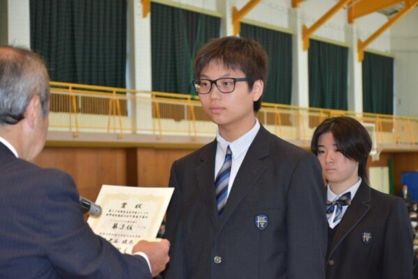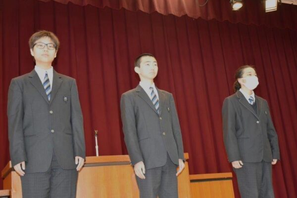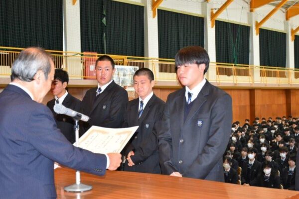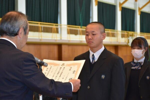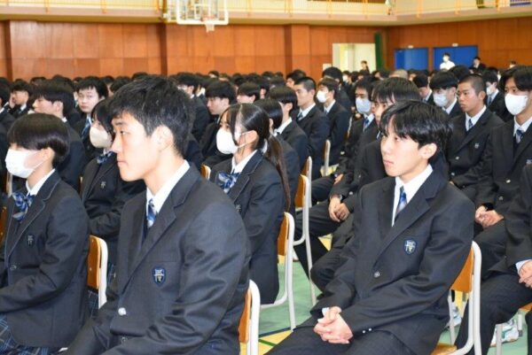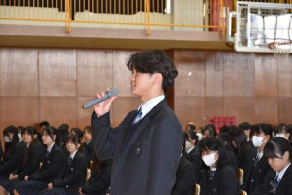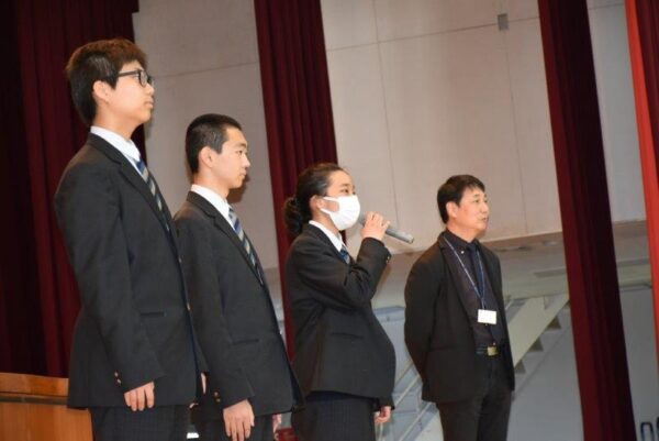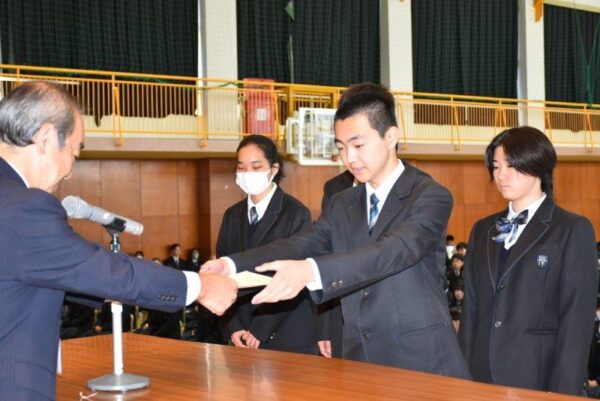 11月10日(月)、11月の全校集会を実施しました。今回は、普段生徒と接する機会の少ない事務室の鳴島事務長からコミュニケーションの大切さについての講話と、生徒指導主任から身だしなみやマナー・モラルについての講話がありました。続いて、先月の体育祭表彰と射撃部の関東大会予選会の表彰伝達が行われ、関東大会出場を決めた射撃部に対する壮行会を行いました。そして、本日から2週間、本校で実習を行う教育実習生の紹介と校歌斉唱で締めくくりました。