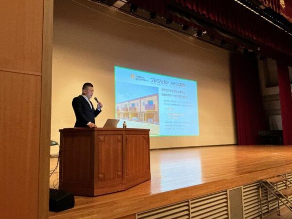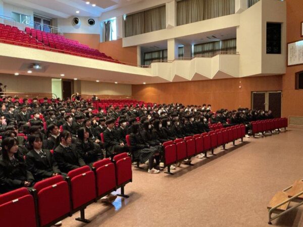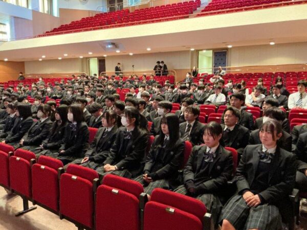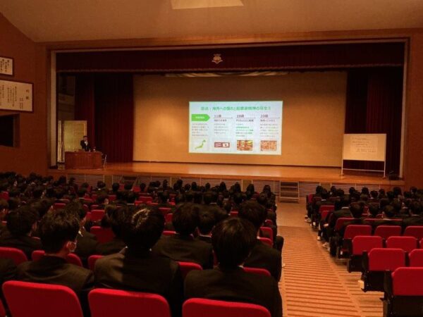 2025年11月17日(月)、本校講堂にて「知的財産教育」の一環として、株式会社フィルカンパニー創業者・取締役会長の 高橋伸彰氏 を講師にお迎えし、3年生を対象に特別講義を行いました。独立行政法人中小企業基盤整備機構(中小機構)が推進する「起業家に必要とされるマインドと資質・能力を有する人材の育成」を目的とした出前授業です。講義は真剣な雰囲気で始まり、高橋氏の語る学生時代に経験した挑戦や挫折、起業家精神が芽生えたきっかけなど、ユーモアを交えた話に生徒たちは熱心に耳を傾けました。特に「失敗を恐れず挑戦することの大切さ」や「自分の人生を自ら経営する楽しさ」という言葉に、多くの生徒が深くうなずいていました。生徒たちは講師の言葉をしっかりと受け止め、メモを取りながら学びを深めていました。講義は「人生には常に無限の選択肢がある。自分の人生を自ら経営することの楽しさを是非知ってほしい」という力強いメッセージで締めくくられ、講堂は大きな拍手に包まれました。生徒からは「起業家の方の考え方や生き方から、失敗を恐れず挑戦することの大切さや自分の人生を自ら経営する楽しさを学ぶことができた」「ビジネスチャンスを見つける視点や、その楽しさに気づき、自分にも何かできるかもしれないと思った」など多くの感想が寄せられました。本校では、今後も生徒の主体性や創造力を育む教育活動を積極的に推進してまいります。高橋さま、本校生徒のためにありがとうございました。