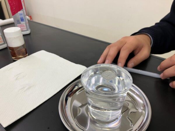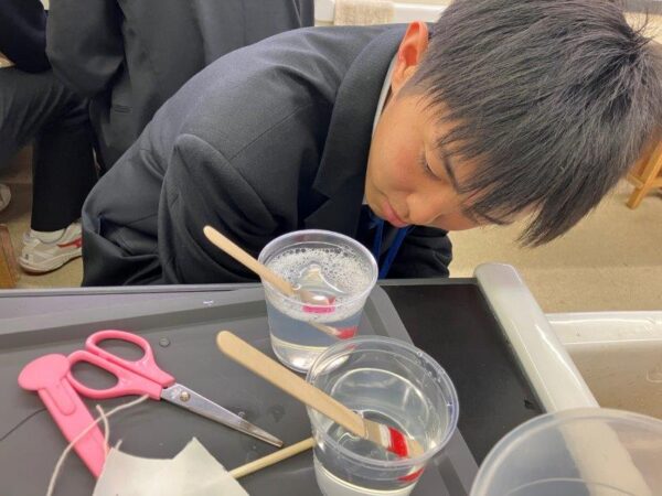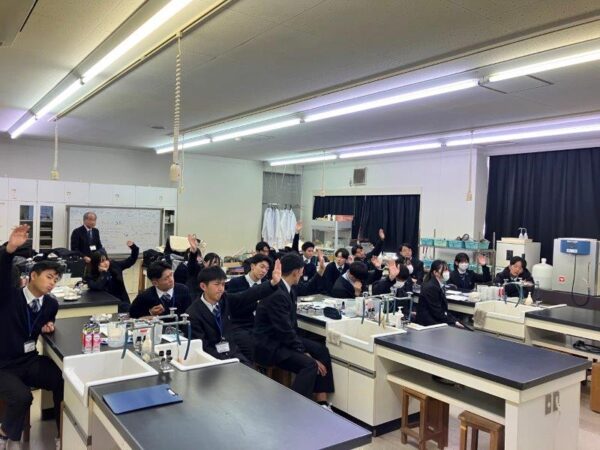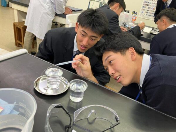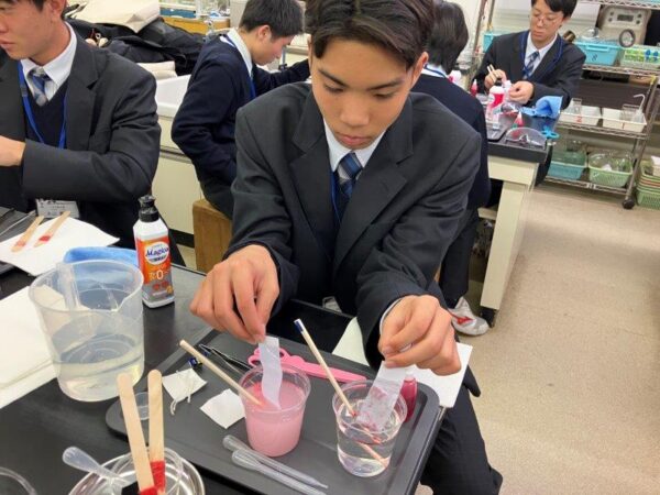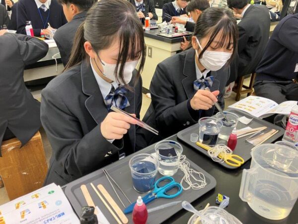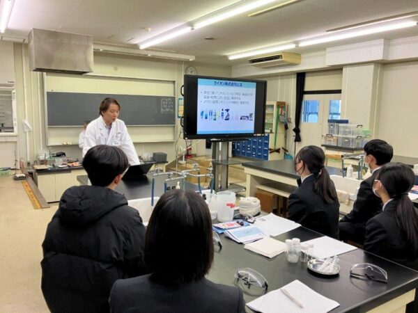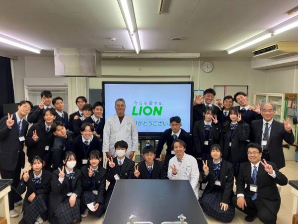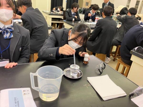 本講座では、企業との連携を通じて化学・環境・製造技術などの分野における実社会での応用を学びました。今回のテーマは「エネルギーと生活を支える技術」。11月26日(水)午後、希望した21名の生徒が、本校化学実験室でライオン株式会社 研究開発本部 戦略統括部の笹本 久 氏、柿澤 恭史 氏による講義と実験を受けました。講義では、SDGsへの取り組みや界面活性剤の仕組みについて学び、企業研究者の仕事に触れることができました。実験では、界面活性剤の「浸透作用」「ローリングアップ」「乳化作用」「分散作用」「再付着防止作用」を実際に確認し、身近な製品に隠された科学技術を体験しました。また、ライオン株式会社の歴史や研究開発の事例紹介を通じて、企業が果たす社会的役割や製品開発の工夫について理解を深めました。生徒からは、「普段使っている洗剤や歯磨きにこんなに多くの科学が関わっていることに驚いた」「SDGsと企業活動のつながりを知り、社会に貢献する仕事の魅力を感じた」という声が寄せられました。身近な製品に潜む科学の面白さを体験し、学びへの意欲を高めることで、今後の進路や社会での役割を考えるきっかけとなりました。