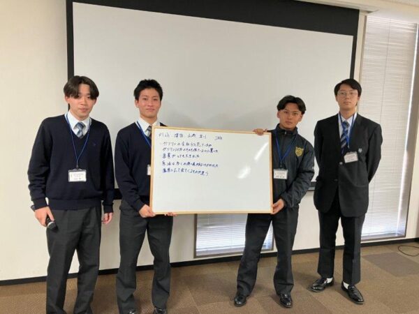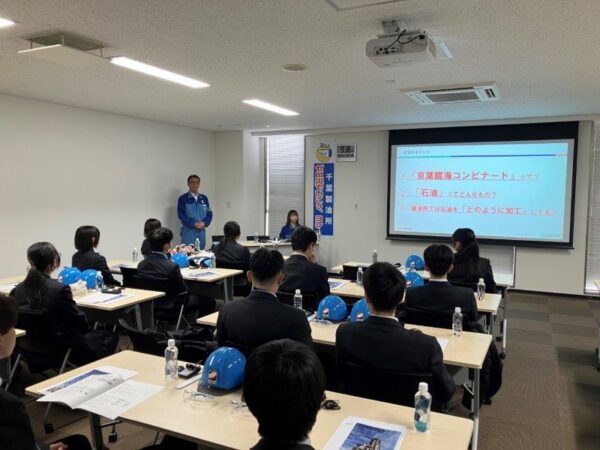 本講座では、企業との連携を通じて、化学・環境・製造技術などの分野における実社会での応用を学びました。11月26日(水)、希望した21名の生徒が「コスモ石油千葉製油所」を訪問しました。今回のテーマは「エネルギーと生活を支える技術」。総務課長の菊地徹氏と総務課の露嵜佐津紀氏から、会社概要や原油の輸入から製品になるまでの流れについて講義を受けた後、加熱炉や蒸留塔など石油精製の現場をバスツアー形式で見学しました。見学後は、この講座を受ける前と受けた後でどのようにイメージが変わったかをテーマにグループ討議と発表を行いました。発表では、「コスモ石油はガソリンだけだと思っていたが、プラスチックや化学製品など生活に欠かせないものが原油から作られていることに驚いた」「精製の工程が複雑で、環境対策にも力を入れていることを知り、企業の責任の大きさを感じた」などの声が上がりました。また、「エネルギー産業は遠い存在だと思っていたが、私たちの生活を支える重要な仕事だと実感した」という意見もあり、参加者の視野が大きく広がったことがうかがえました。エネルギーと私たちの生活のつながりを実感できる貴重な学びの機会となり、今後の進路選択や将来のキャリア形成に向けて視野を広げるきっかけとなりました。探究心を育み、科学技術への関心を深めることで、将来の学びや社会での活躍につながる体験となりました。