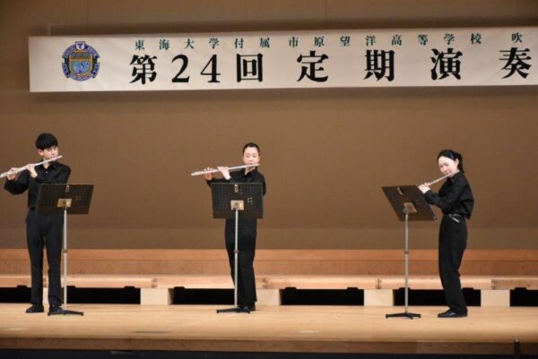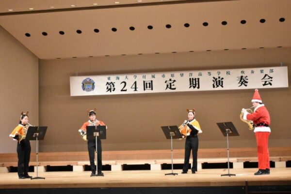12月27日(土)、市原市市民会館大ホールを会場に、本校吹奏楽部が第24回定期演奏会を開催しました。吹奏楽部は今年の「東関東吹奏楽コンクール」で金賞、東関東代表として出場した「東日本学校吹奏楽大会」でも金賞を受賞しています。今年の定期演奏会は3部構成。第Ⅰ部は、スティーヴン・ライニキー作曲「セドナ」をはじめとするシンフォニック ステージ、第Ⅱ部は少人数ごとのアンサンブル ステージ、第Ⅲ部は「アナと雪の女王・メドレー」など映画音楽を特集したポップス ステージです。開演から最後のアンコールまで会場が一体となって大いに盛り上がりました。ご来場くださった皆様、ともにステージを盛り上げていただきありがとうございました。そして、3年生はこの演奏会をもって引退となります。3年間お疲れさまでした。ますますの活躍を期待しています。