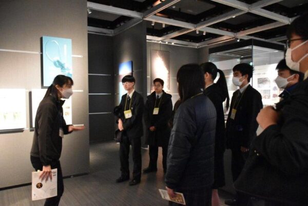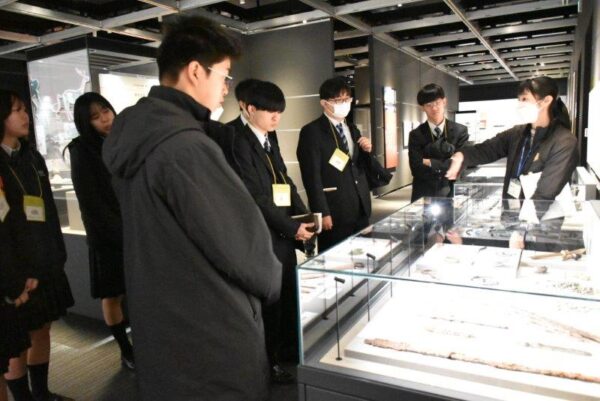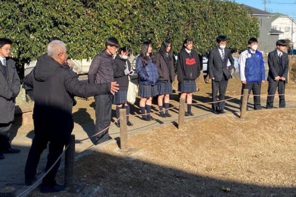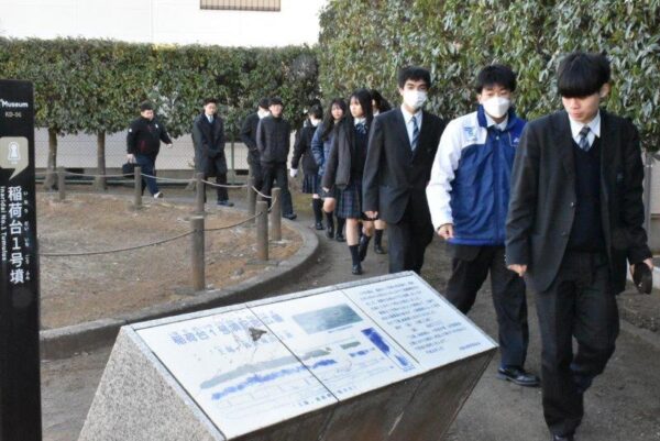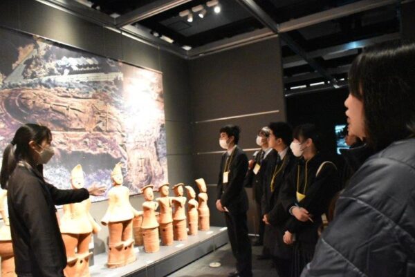 1月31日(土)、土曜講座「市原市の歴史と望洋高校の歴史」でI’Museum Center(市原歴史博物館)を訪れました。はじめに、国産最古と考えられる銀象眼の銘文のある鉄剣(「王賜」銘鉄剣)が出土した稲荷台1号墳跡を見学し、歴史博物館に移動しました。館では、学芸員の西先生に時代ごとにポイントを絞って解説していただきました。市原市域が現在の千葉県で最初に人々が生活したと考えられていることや、市内に1600基を超える古墳が存在することなどを教えていただきました。また、江戸時代の絵地図と現在の航空写真を対比させるコーナーや、第2次世界大戦中の警戒警報・空襲警報の詳細な記録の集計・分析など独自の展示や研究もご紹介いただきました。民俗展示室では、現存する唯一の「五大力船」の舵など貴重な展示も見ることができました。その後、隣接する体験館に移動し、復元された竪穴住居に入ったり、昭和の時代の遊びなどを体験して楽しみました。解説していただいた西先生をはじめ市原歴史博物館・体験館の皆様、ありがとうございました。