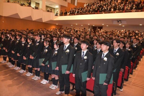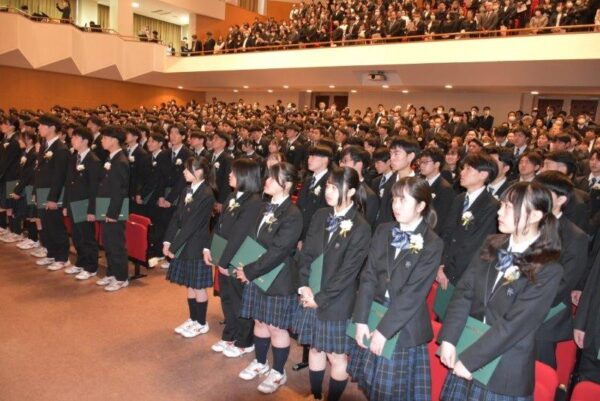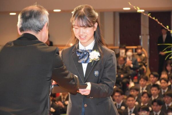 3月2日(月)、2025年度 第40回卒業証書授与式を挙行しました。朝方は肌寒く感じられましたが、徐々に晴天が広がり、卒業生の前途を祝福するような一日でした。式典は吹奏楽部の演奏する「威風堂々」での入場に始まり、担任の呼名によって全員が校長先生から一人ずつ卒業証書を授与されました。総長賞・生徒会功労賞の表彰伝達、3カ年皆勤賞の表彰、校長告辞と続き、ご来賓を代表して後援会会長より心のこもった祝辞をいただきました。卒業生から記念品が贈呈され、在校生代表の生徒会長からの送辞や卒業生代表からの感動的な答辞で涙ぐむ姿も見られました。全員で歌う最後の校歌は、講堂の外まで響きわたるほどの大合唱となり、厳粛な中にも暖かな雰囲気の式が幕を閉じました。卒業生の皆さん、卒業おめでとうございます。これからのますますの活躍に期待しています。